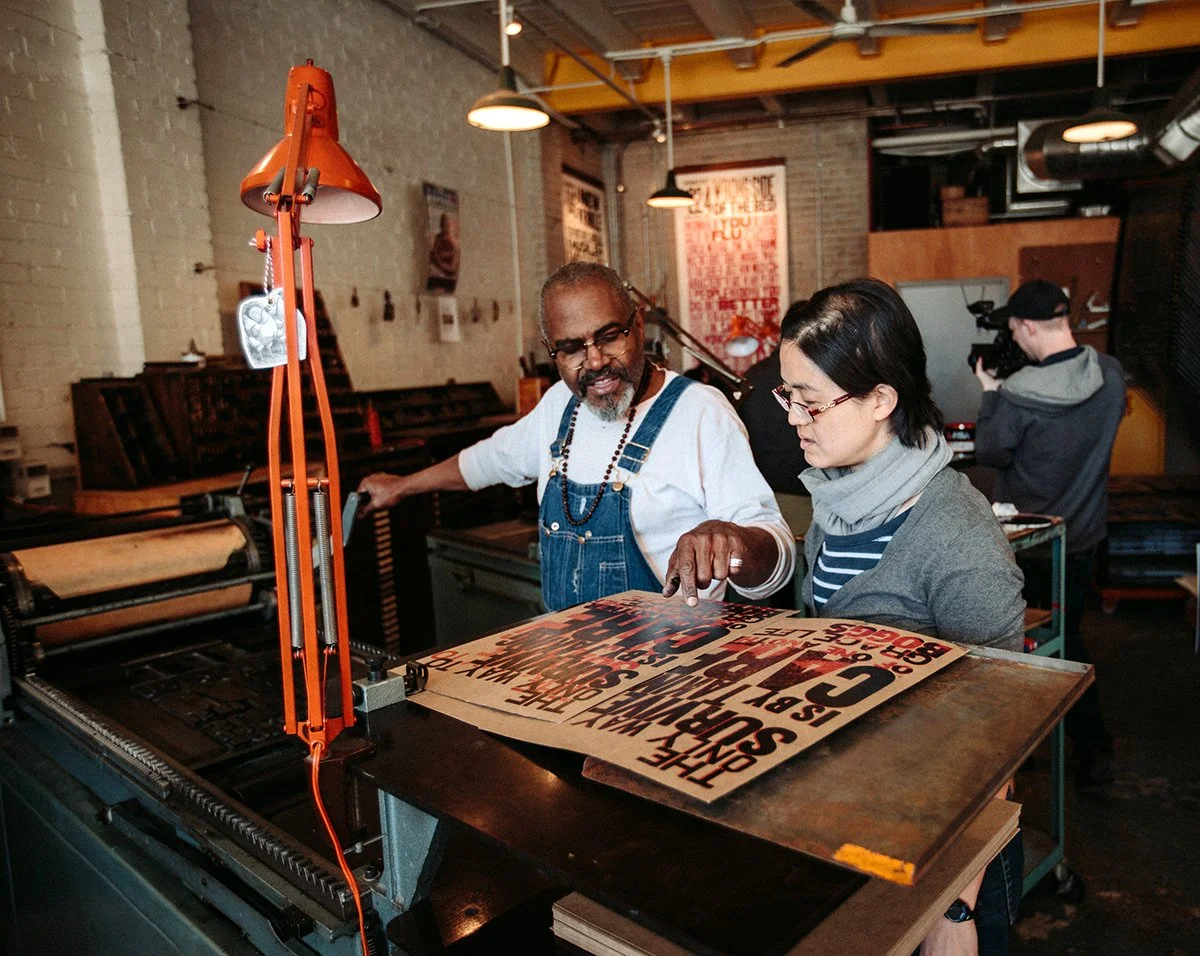Guided Shop Time offers a comprehensive, hands-on letterpress printing experience with our Printer-in-Residence, including a design consultation, a 4-hour private lesson, and supplies for $300, preparing clients for independent work in Open Studio sessions.
